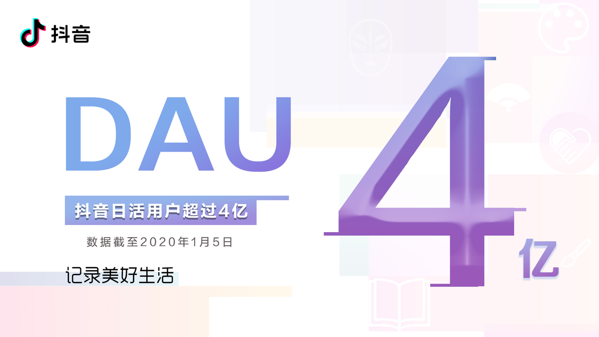 1月6日,抖音发布《2019抖音数据报告》。报告披露了抖音最新的成绩单:截至2020年1月5日,抖音日活跃用户数已经突破4亿,作为国内最大的短视频平台,继续领跑市场。